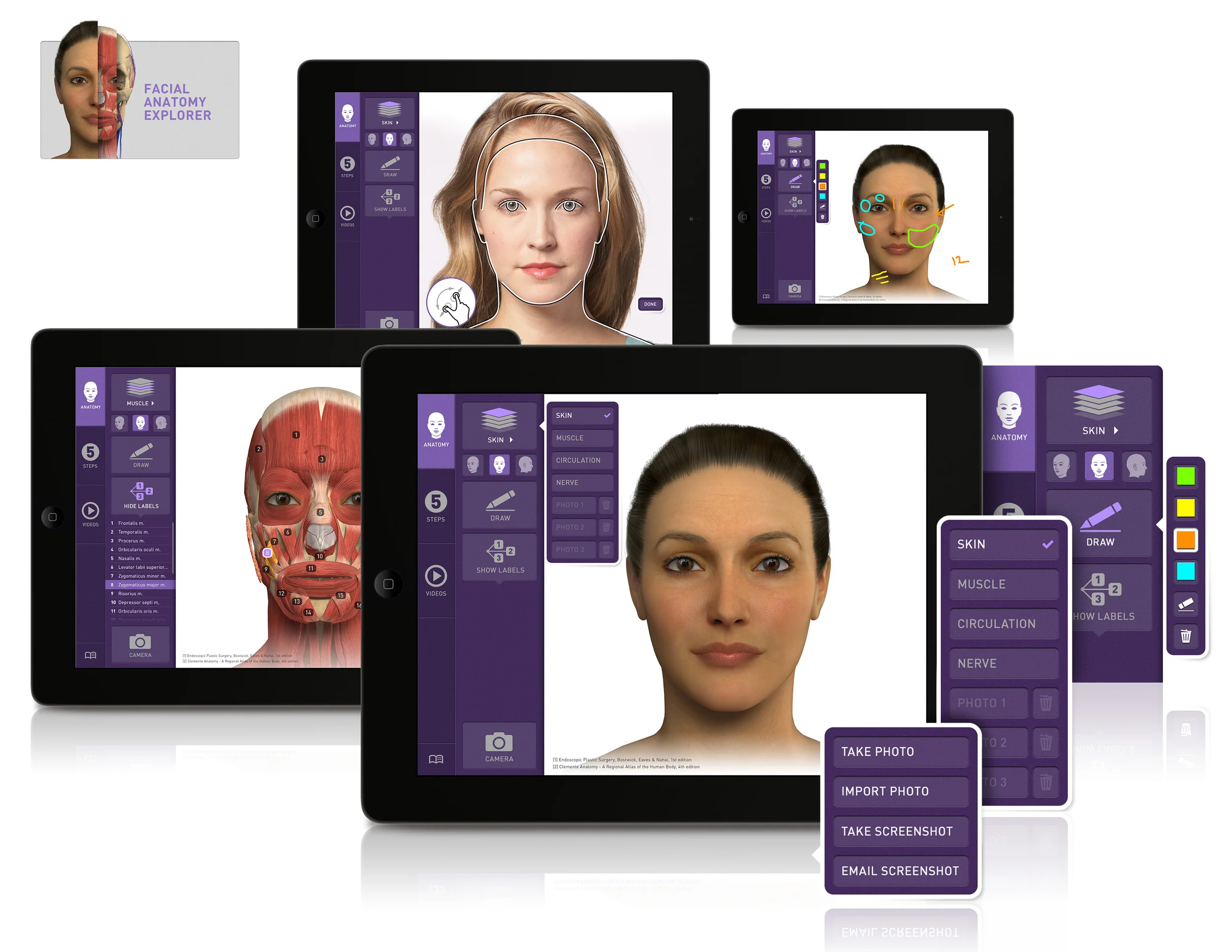 In the app, the physician is able to control the view of various facial anatomy layers. They have the ability to peel back skin, muscle, vein, nerve, and bone layers, or can view these layers through the one-touch navigation feature. The Facial Anatomy App can rotate the face to provide a full-range view during patient consultations. In addition, the physician can draw on the screen to map out injection areas for optimal cosmetic effect.