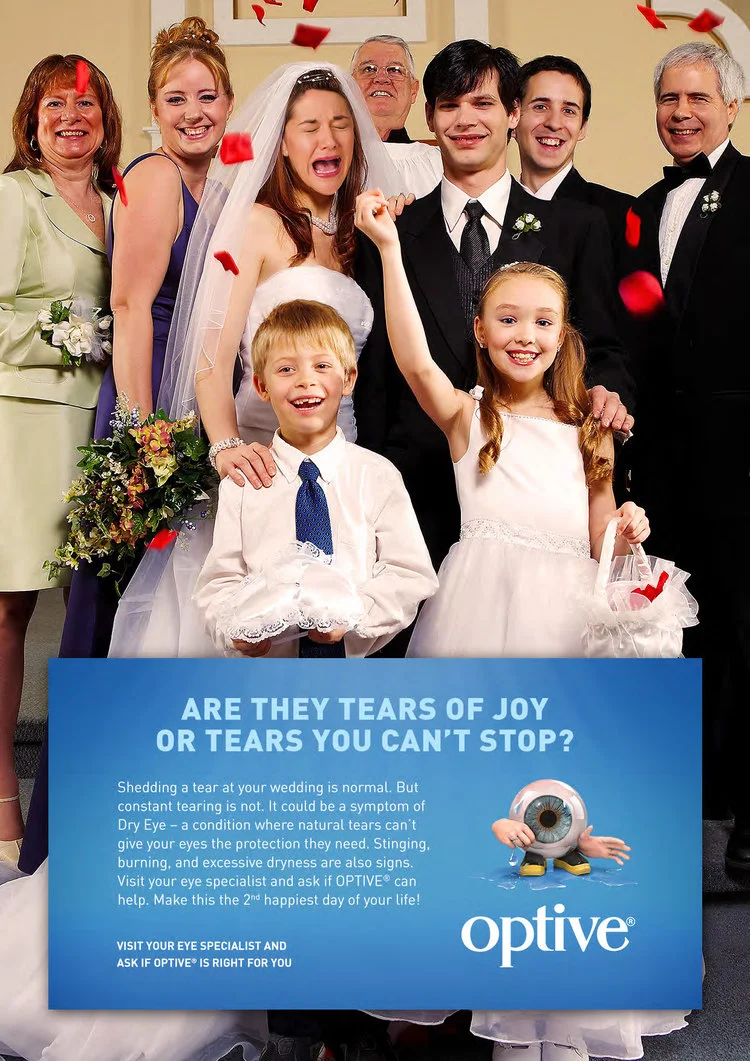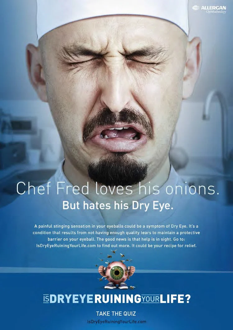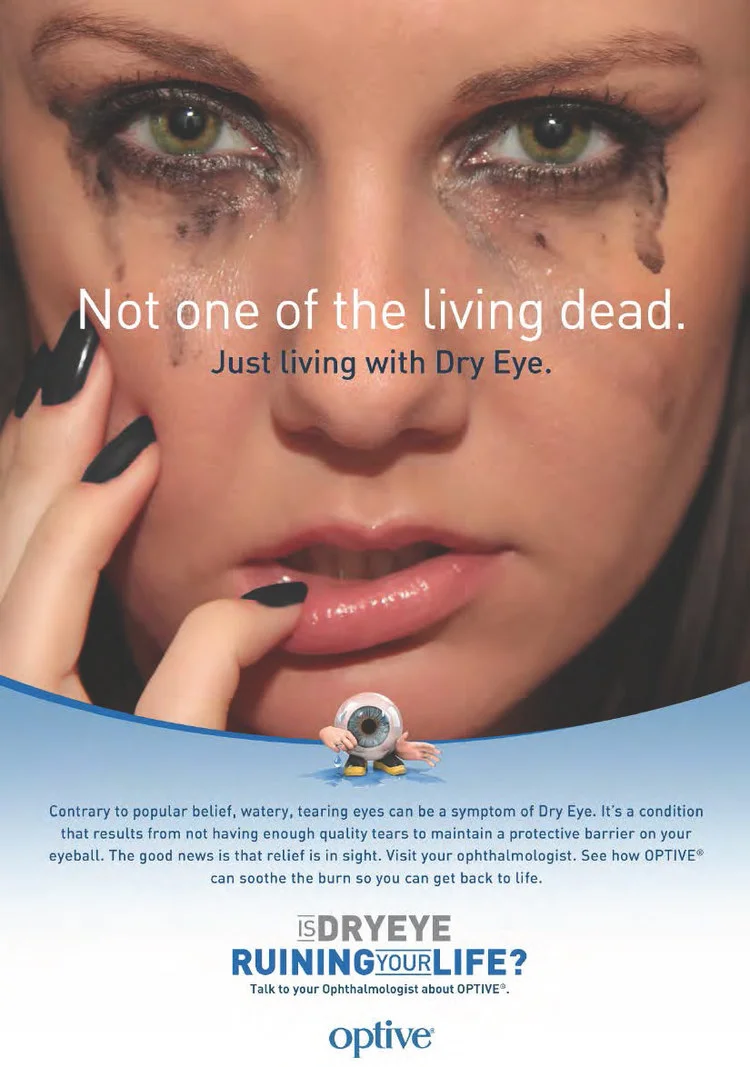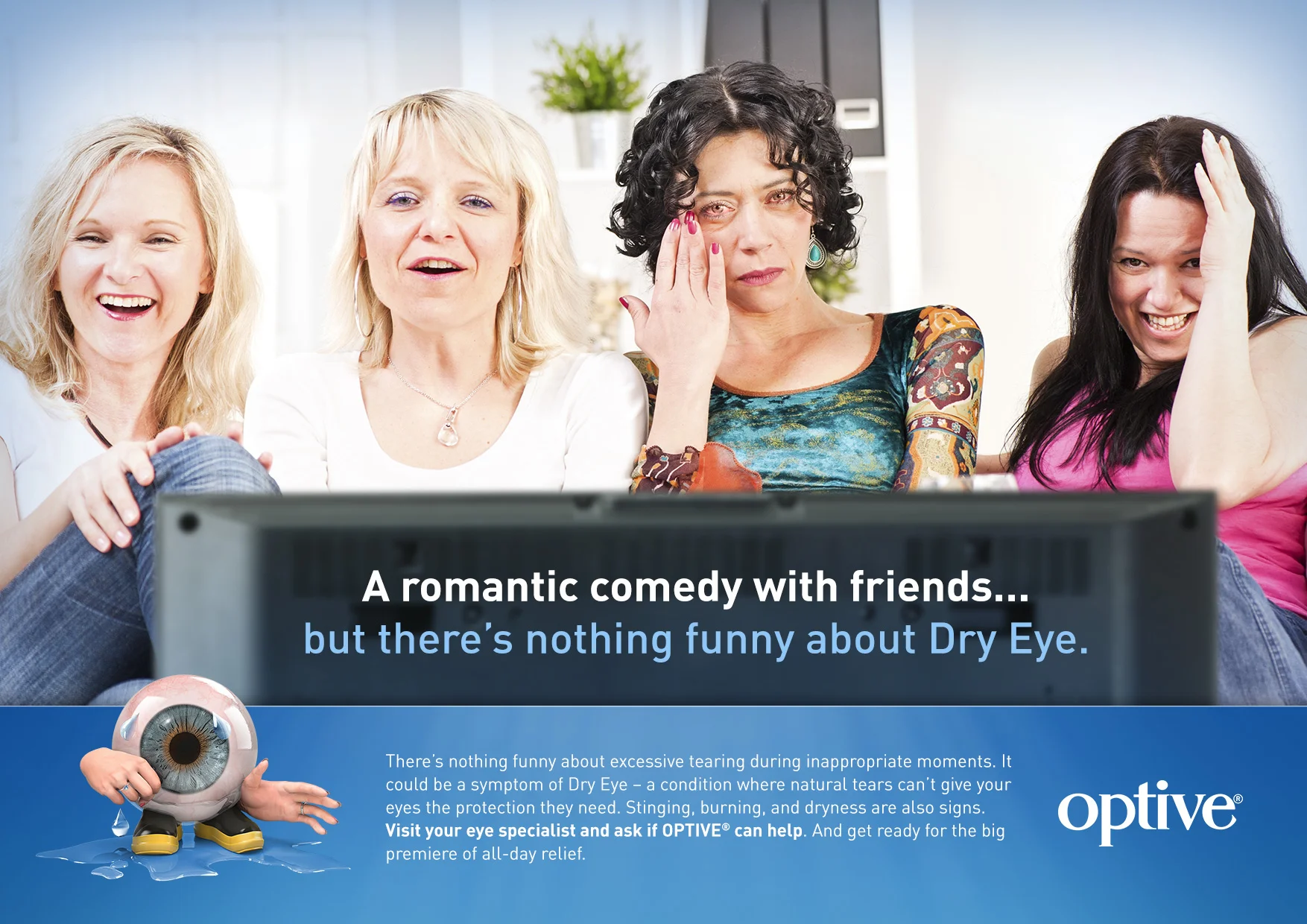 Whether unbranded or lightly branded, this Dry Eye awareness campaign employs the OPTIVE® Symptom Characters to focus on how the condition can impact the daily lives of sufferers. The concepts were developed as stand-alone A4 print ads and are being adapted as teaser banner ads driving traffic to a symptom/take-the-quiz microsite. The answers given direct the participant to the appropriate product on the fully-branded OPTIVE® website.