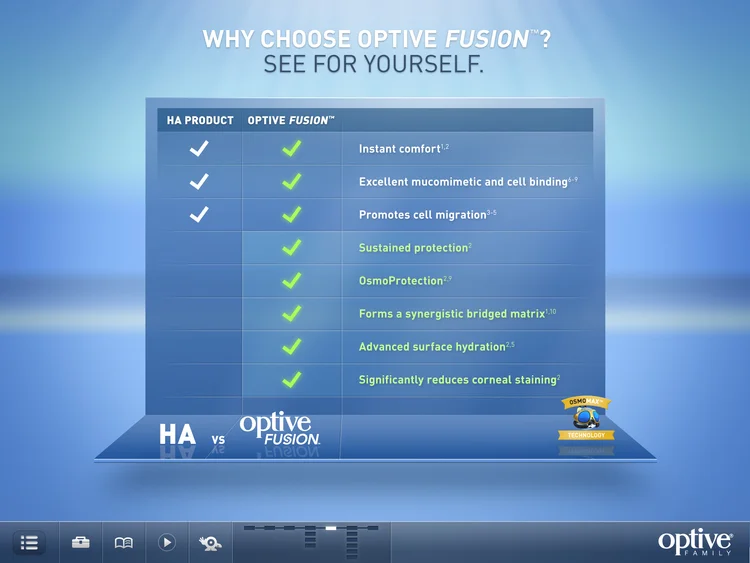 OPTIVE® is known throughout the eye care industry for its innovation and advanced technology. With the launch of OPTIVE FUSION™, new HA technology in Dry Eye treatment seven years in the making became a reality. Combining the two most recognised eye care polymers [HA + CMC] into one powerfully soothing drop was a "first" for OPTIVE® and the entire Dry Eye category. This was big news.