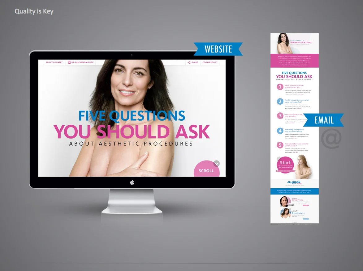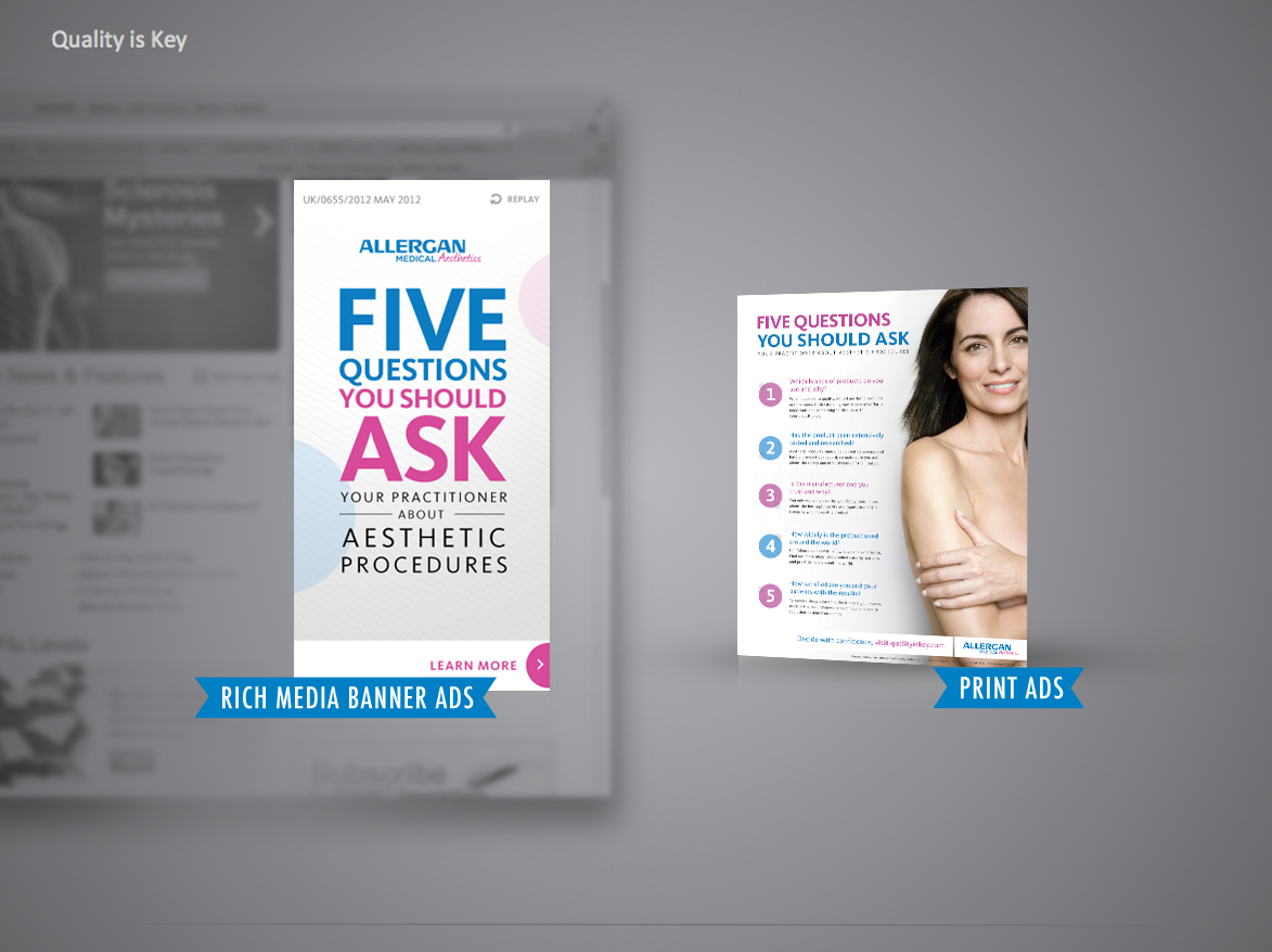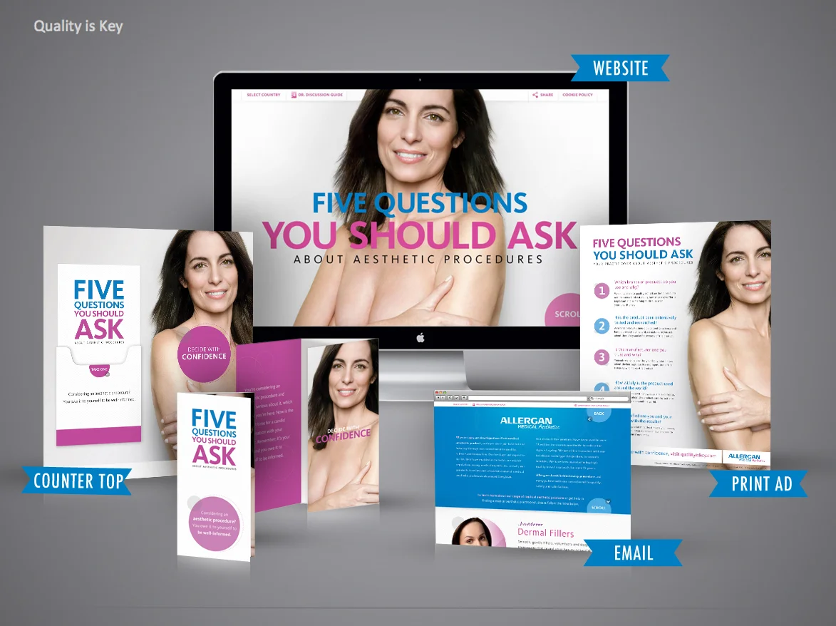 Research showed that the majority of patients weren't even aware of what products were going to be used in their medical aesthetics procedures. Rather than responding to bad Euro press,Quality Is Key was launched encouraging patients to ask their doctors what brand of products they use. The campaign consisted of print, online banner ads, a microsite, and in-office materials focusing on five key questions to drive informed conversations between patients and their doctors.