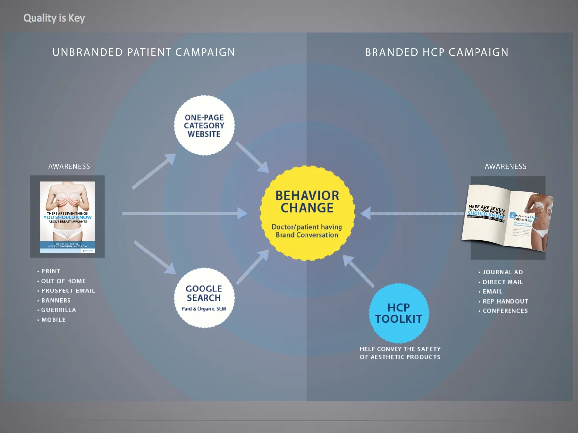 The Allergan "Quality Is Key" integrated campaign focuses on changing behaviour during a health care consultation. A competitor created a global scandal by producing inferior and defective breast implant products. As the industry leader, Allergan needed a way to separate its quality products from the competitor's inferior products. The idea was to differentiate themselves as the leader and to help ease patients' growing fears aimed at the medical aesthetics industry.