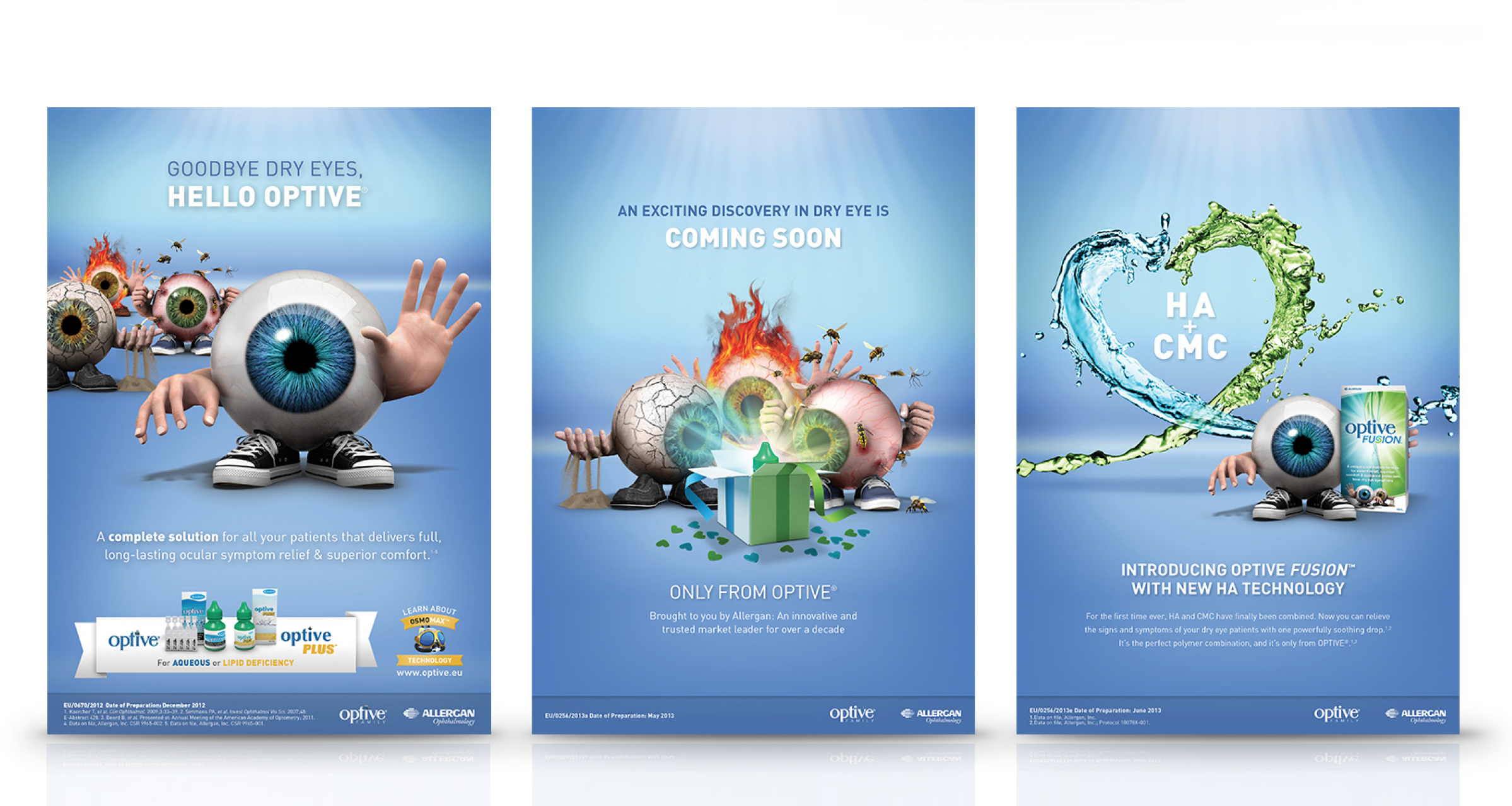 The launch of OPTIVE FUSION® was accompanied by a compelling new package design not only for this breakthrough product, but for the entire OPTIVE family. Viewed in progression, the campaign shows the dedication and commitment Allergan has for driving advancement in the dry eye marketplace.